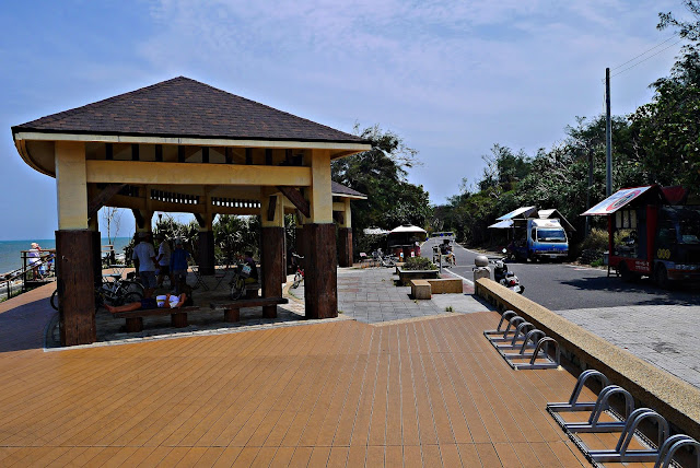 儘管踩踏協力車略感費力,不過沿途綠蔭夾道的良辰美景,足以撫慰都市人嚮往自然的心靈。耗不到半個小時的時間,我們抵達了臨海而建的觀海涼亭。這裡是南北段的中繼站,不少流動攤販在此設攤,與周遭的景致顯得格格不入。